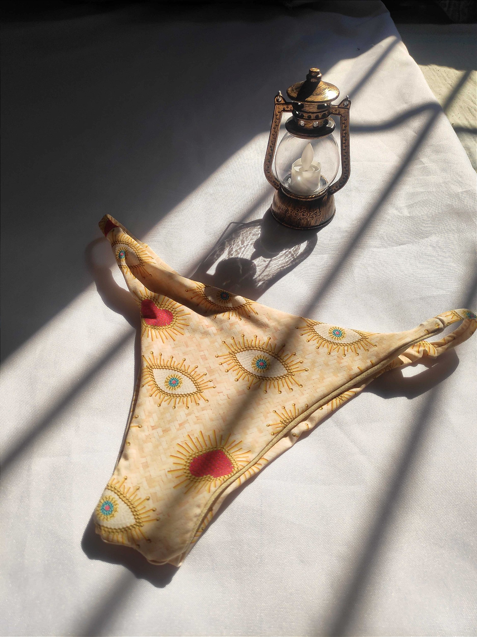 Bottom cintura baixa, todo forrado embutido com elástico na parte da frente, lateral fina com elástico. Costas cortada no fio duplo e costura no meio modelando e desenhando melhor no seu copo na parte de trás.